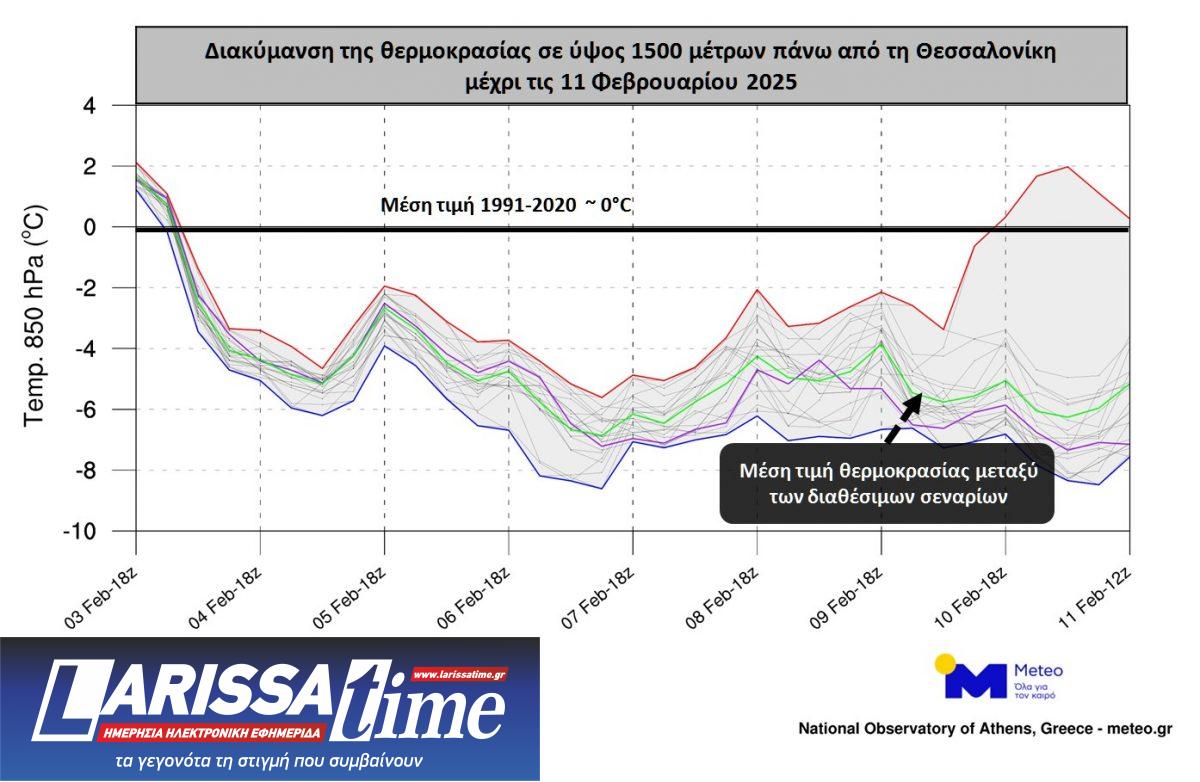 Στην εικόνες που ακολουθούν βλέπουμε ενδεικτικά το εύρος διακύμανσης της θερμοκρασίας έως τις 11/02 σε ύψος 1500 περίπου μέτρων επάνω από την Αθήνα και τη Θεσσαλονίκη. Η Αθήνα επιλέγεται ως ενδεικτική για την ανατολική και νότια χώρα και η Θεσσαλονίκη ως ενδεικτική για την κεντρική και βόρεια χώρα.