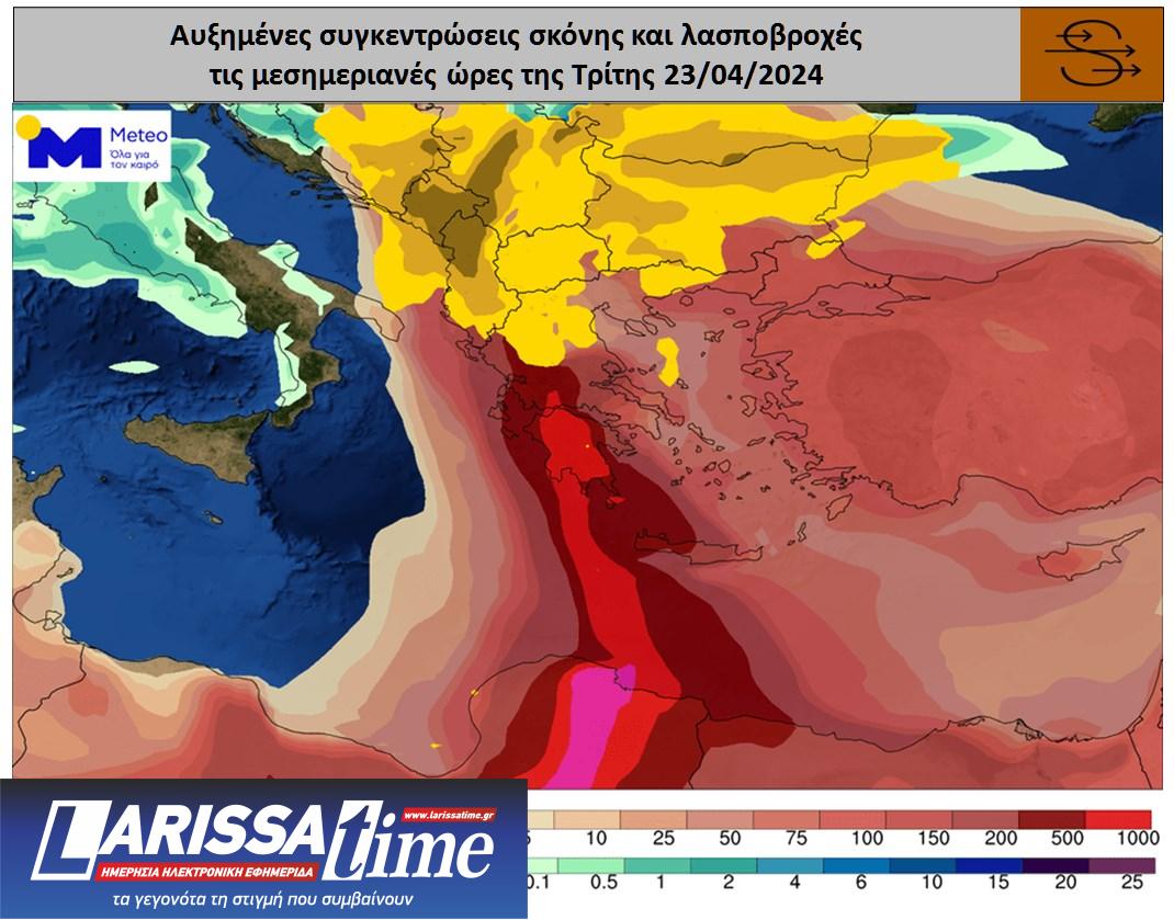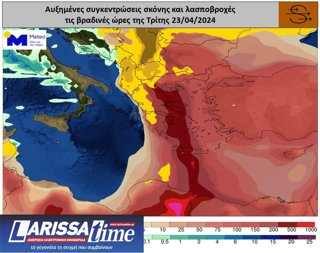 – Με κόκκινες αποχρώσεις η συγκέντρωση σκόνης στην ατμόσφαιρα κατά τις μεσημεριανές και βραδινές ώρες της Τρίτης.