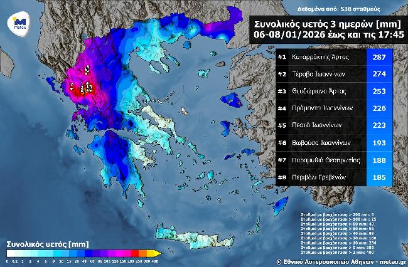 Την ίδια ώρα, τα στοιχεία του meteo.gr δείχνουν πολύ υψηλά ύψη βροχής στο διάστημα 6-8 Ιανουαρίου, με την Ήπειρο να βρίσκεται στο επίκεντρο. Σύμφωνα με το Εθνικό Αστεροσκοπείο Αθηνών, στα ορεινά της Άρτας καταγράφηκαν έως και 287 χιλιοστά βροχής, ενώ περισσότερα από 100 χιλιοστά σημειώθηκαν σε 25 σταθμούς σε όλη τη χώρα. Αντίστοιχα υψηλές τιμές καταγράφηκαν σε Θράκη, Δυτική Μακεδονία, Θεσσαλία, Στερεά Ελλάδα και στο Ιόνιο.