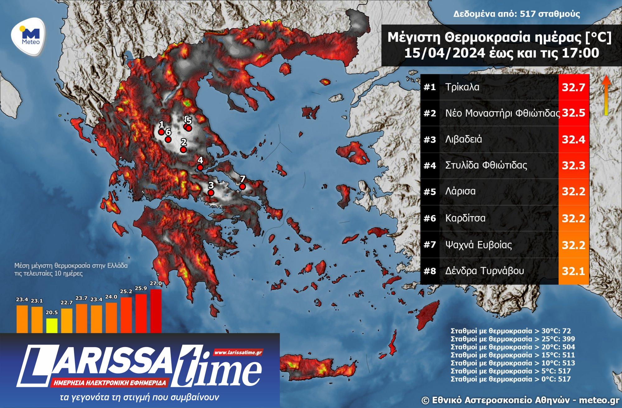 Όπως προκύπτει από τα στοιχεία, η μέγιστη θερμοκρασία ξεπέρασε κατά τόπους τους 32 °C ενώ η μέση μέγιστη θερμοκρασία τη Δευτέρα 15/04 (26.9 °C) ήταν κατά 1.0 °C υψηλότερη αυτής της Κυριακής 14/04 (25.9 °C).