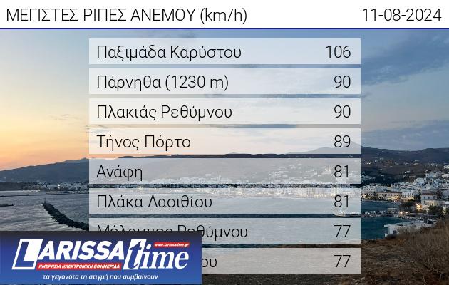 Η υψηλότερη μέγιστη ριπή ανέμου σημειώθηκε στην Παξιμάδα Καρύστου με 106 χιλιόμετρα την ώρα, ενώ οι οκτώ υψηλότερες μέγιστες ριπές παρουσιάζονται στον πίνακα που δημοσιεύει το δίκτυο αυτόματων μετεωρολογικών σταθμών του Εθνικού Αστεροσκοπείου Αθηνών / meteo.gr.