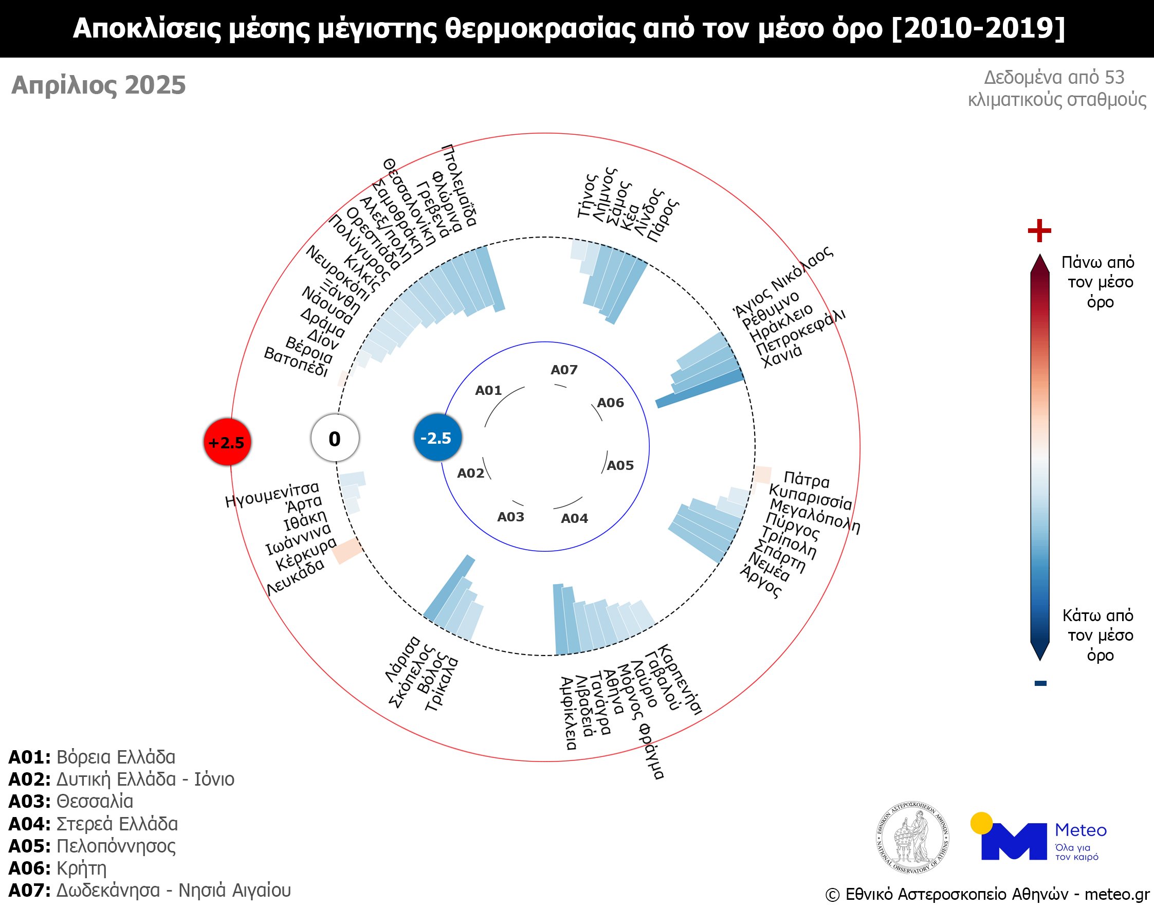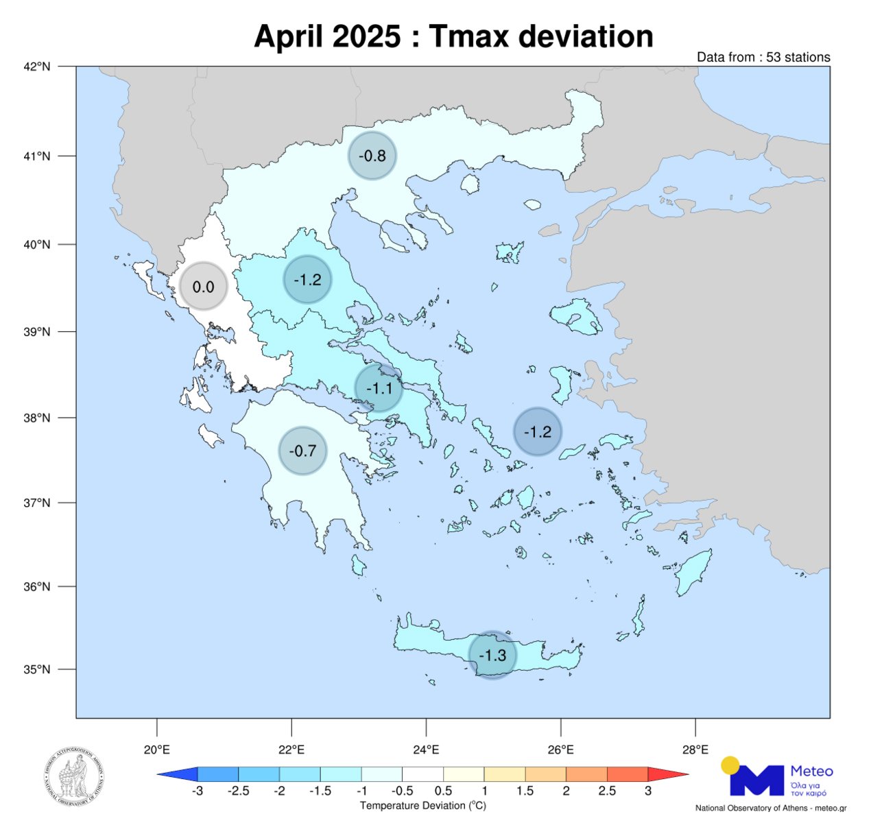 Σύμφωνα με το δίκτυο των 53 μετεωρολογικών σταθμών του meteo.gr του Εθνικού Αστεροσκοπείου Αθηνών (Ε.Α.Α) που λειτουργούν ανελλιπώς από το 2010 μέχρι σήμερα, τον Απρίλιο του 2025 η μέση τιμή των μεγίστων ημερήσιων θερμοκρασιών κυμάνθηκε κάτω από τα κανονικά για την εποχή επίπεδα σχεδόν σε όλες τις περιοχές της χώρας (σε σχέση με τον μέσο όρο της περιόδου 2010-2019).