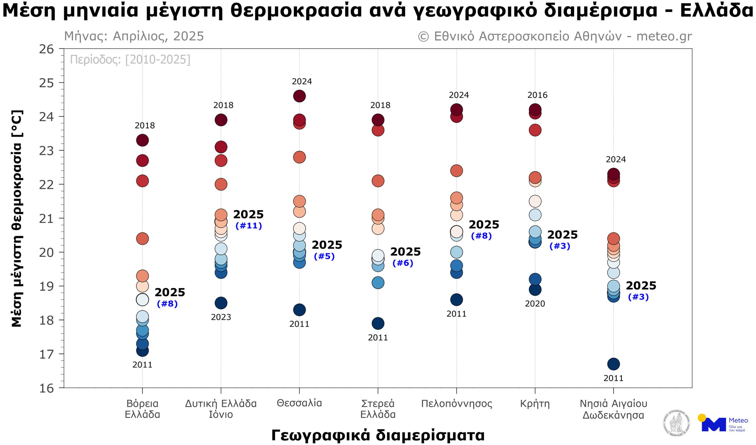 Η Δυτική Ελλάδα ήταν το μοναδικό γεωγραφικό διαμέρισμα όπου η μέση μέγιστη θερμοκρασία για τον Απρίλιο του 2025 δεν ήταν κάτω από τη μέση τιμή της περιόδου 2010-2019.