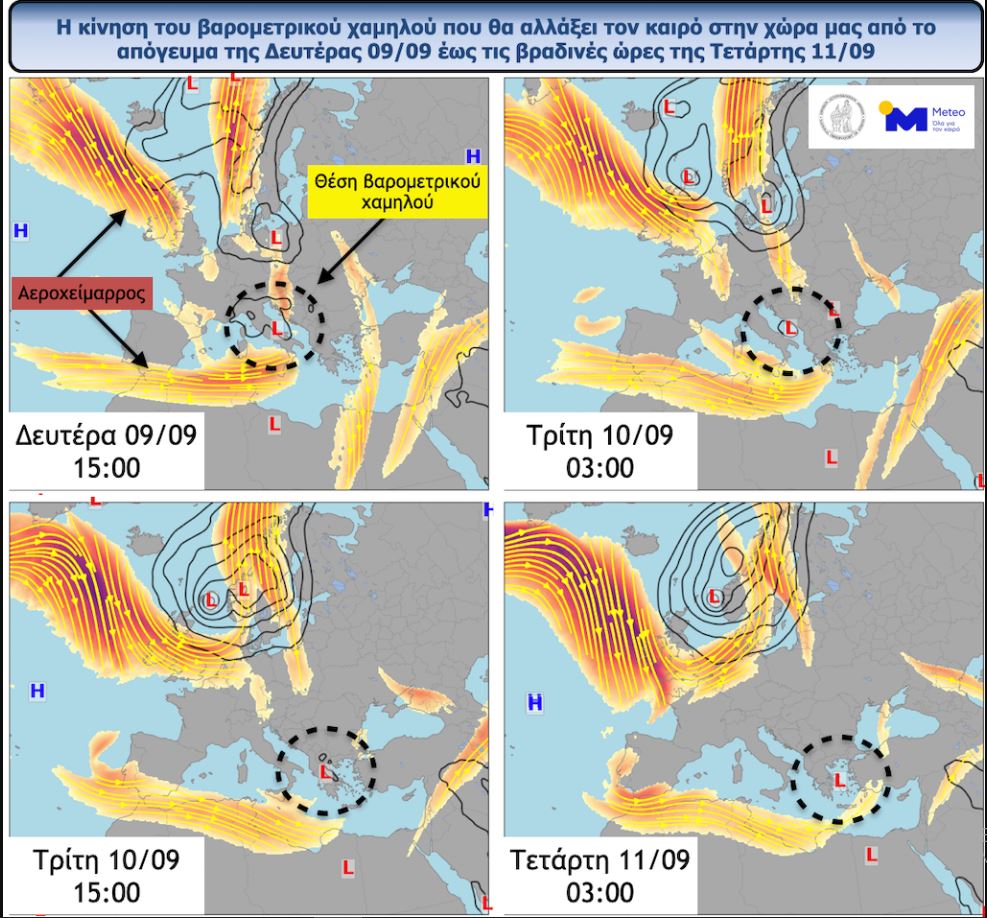 Σύμφωνα με τα νεότερα προγνωστικά στοιχεία του meteo.gr/Εθνικού Αστεροσκοπείου Αθηνών βροχές και καταιγίδες αναμένονται σε μεγάλο μέρος της χώρας έως τις βραδινές ώρες της Τετάρτης 11/09. Κύρια αιτία για αυτή την αλλαγή του καιρού είναι η μεταβολή της ατμοσφαιρικής κυκλοφορίας πάνω από την Ευρώπη καθώς και η θέση του αεροχειμάρρου (πορτοκαλί αποχρώσεις στην Εικόνα 1) πάνω από τη Μεσόγειο η οποία έχει συμβάλει στην ανάπτυξη ενός βαρομετρικού χαμηλού πάνω από την περιοχή της Ιταλίας (Εικόνα 1). Υπενθυμίζουμε ότι, ο αεροχείμαρρος είναι ένα ισχυρό ρεύμα αέρα σε ύψος περίπου 10-11 χιλιομέτρων από την επιφάνεια της γης με κίνηση κατα βάση από τα δυτικά προς τα ανατολικά και η κίνηση του καθορίζει την δημιουργία και τη κίνηση των βαρομετρικών συστημάτων. Η ανατολική-νοτιοανατολική κίνηση του βαρομετρικού χαμηλού από την περιοχή της Ιταλίας προς τα Νότια Βαλκάνια και τη χώρα μας κατά τη διάρκεια της Δευτέρας 09/09 θα έχει ως αποτέλεσμα την σταδιακή αλλαγή του καιρού από τα δυτικά της χώρας μας με βροχές και καταιγίδες.
