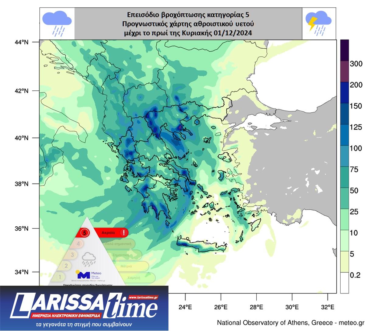 Στον παρακάτω προγνωστικό χάρτη παρουσιάζεται ο εκτιμώμενος αθροιστικός υετός έως τις πρωινές ώρες της Κυριακής 01/12/2024.