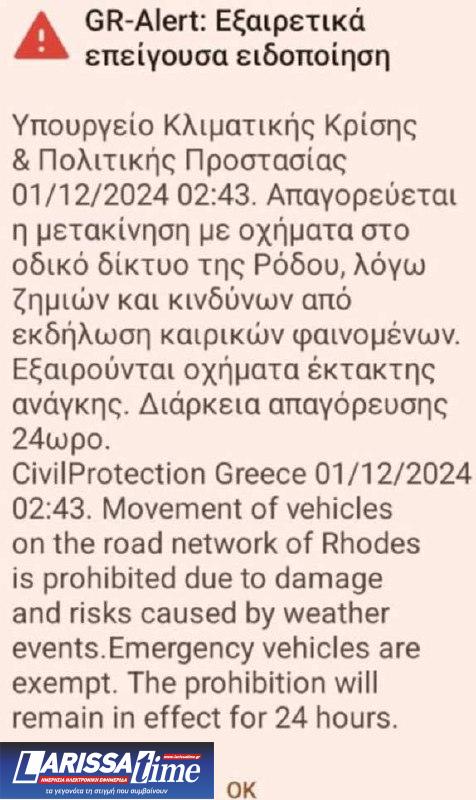 Με μήνυμα που απέστειλε στους κατοίκους της Ρόδου, το αρμόδιο υπουργείο Κλιματικής Κρίσης και Πολιτικής Προστασίας απαγορεύει στους κατοίκους τις μετακινήσεις σε όλο το νησί.