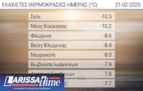 Στη Βεύη Φλώρινας εντοπίστηκε -8,6 βαθμοί Κέλσιου και ακολούθησαν το Νευροκόπι (-8,0 βαθμοί Κέλσιου), Βωβούσα Ιωαννίων (-7,9 βαθμοί Κέλσιου), Δοτσίκο Γρεβενών (-7,8 βαθμοί Κέλσιου) και Αριδαία Πέλλας (-7,7 βαθμοί Κέλσιου).