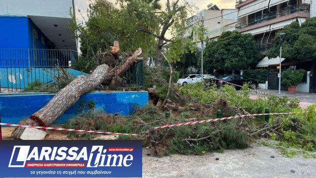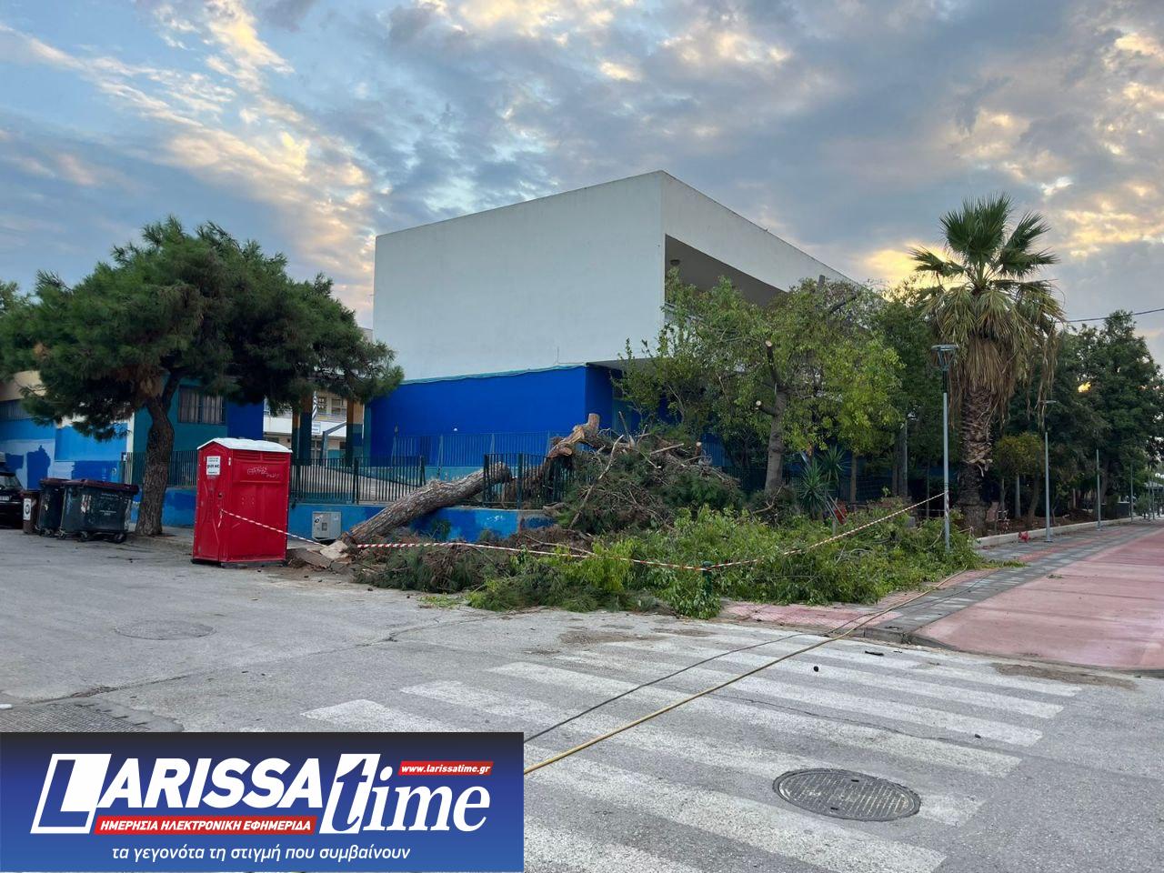 Το δέντρο έπεσε στα κάγκελα του σχολείου και τμήμα του βρέθηκε στο προαύλιο
