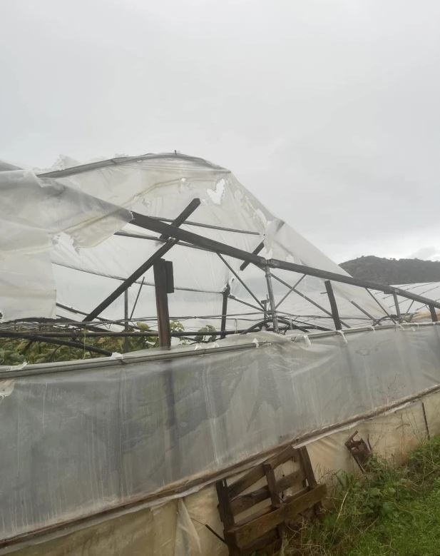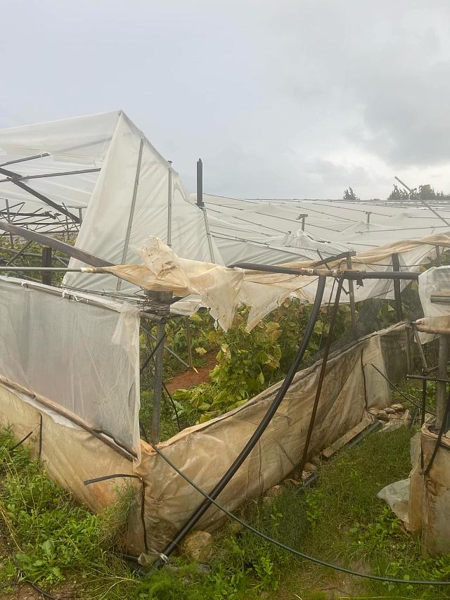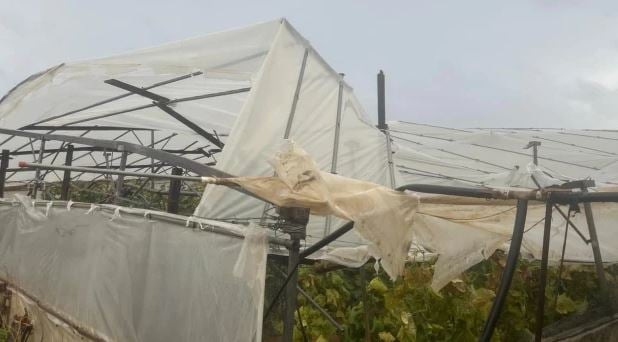 Οι παρακάτω φωτογραφίες, από το χωριό Κλήμα του δήμου Φαιστού, αποτυπώνουν το μέγεθος των προβλημάτων που άφησε πίσω της η κακοκαιρία. Συγκεκριμένα, ένα θερμοκήπιο υπέστη σοβαρές ζημιές καθώς ξηλώθηκε εντελώς η σκεπαστή οροφή του από τον ισχυρό άνεμο και την έντονη βροχόπτωση.