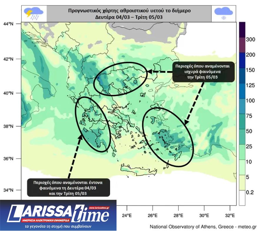 Σύμφωνα με τα προγνωστικά στοιχεία του meteo.gr / ΕΑΑ, κύρια χαρακτηριστικά του καιρού του διημέρου θα είναι οι βροχές και οι καταιγίδες – με κατά τόπους έντονα φαινόμενα – οι χιονοπτώσεις κυρίως στα ηπειρωτικά ορεινά και οι ενισχυμένοι άνεμοι (νότιοι τη Δευτέρα 04/03 και δυτικοί την Τρίτη 05/03).