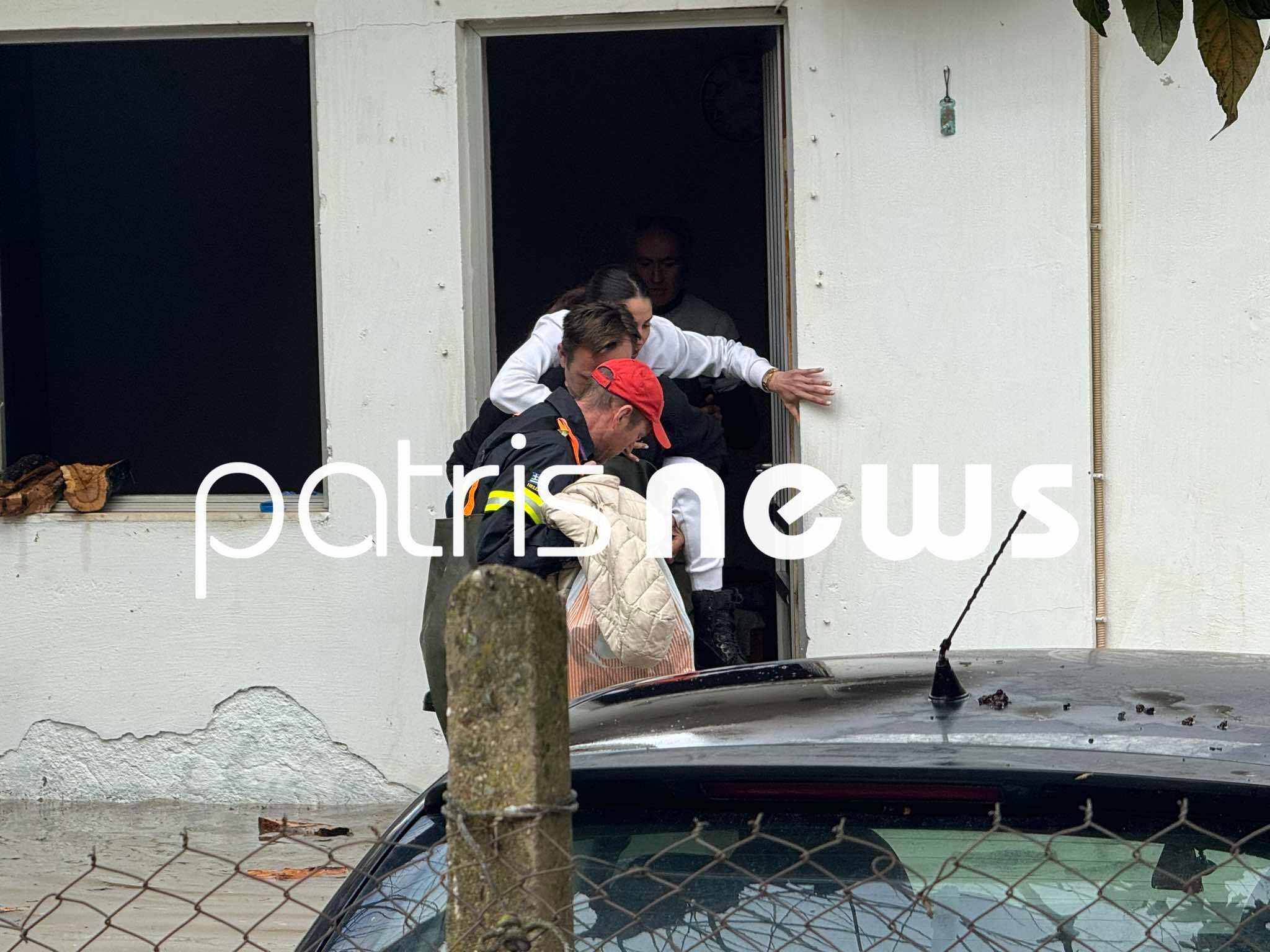 Όπως φαίνεται και στις εικόνες, οι πυροσβέστες μετέφεραν στην κυριολεξία στα «χέρια» τους, τους ενοίκους του σπιτιού αλλά και το σκυλάκι τους, καθώς το σπίτι τους πλημμύρισε.
