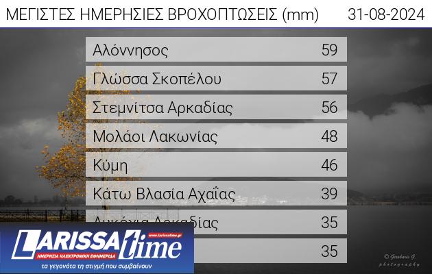 Στον σχετικό πίνακα παρουσιάζονται οι 8 σταθμοί του δικτύου που κατέγραψαν τα μεγαλύτερα ύψη βροχής έως τις 18:00 περίπου του Σαββάτου 31/08.
