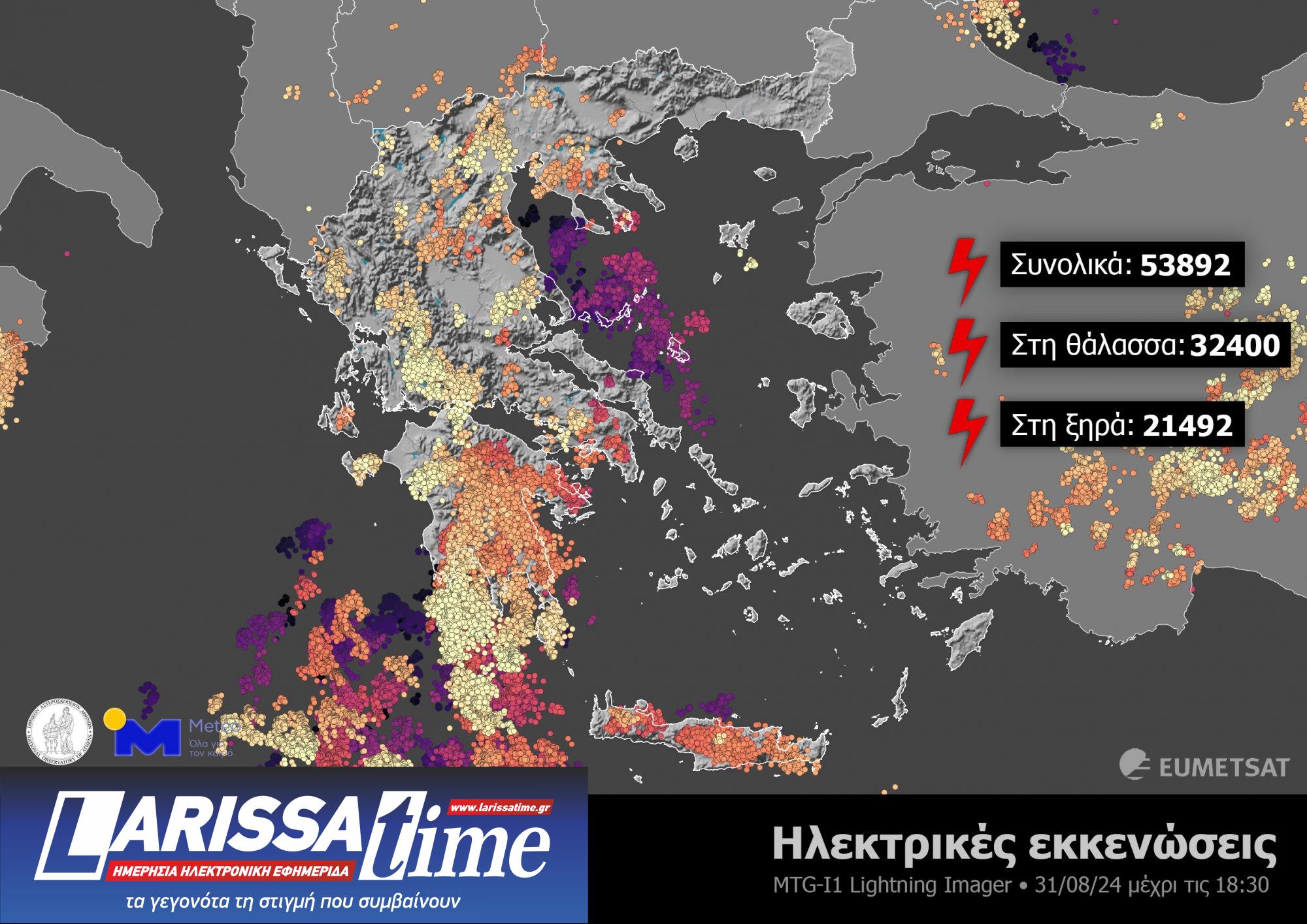 Στον χάρτη που ακολουθεί σημειώνονται οι ηλεκτρικές εκκενώσεις που κατέγραψε το όργανο Lightning Imager του δορυφόρου MTG-I1 από την αρχή του εικοσιτετράωρου έως τις 18:30 ώρα Ελλάδας.