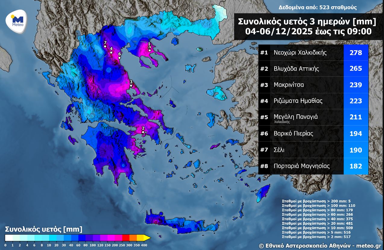 Όπως φαίνεται χαρακτηριστικά στον χάρτη, σύμφωνα με το δίκτυο σταθμών του meteo.gr / Εθνικού Αστεροσκοπείου Αθηνών, το ύψος βροχής ξεπέρασε τα 100 χιλιοστά σε 110 σταθμούς, τα 80 χιλιοστά σε 179 σταθμούς και τα 60 χιλιοστά σε 266 σταθμούς.