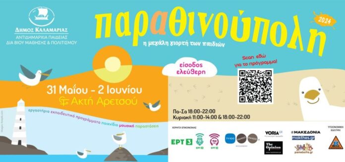 Για τρεις ημέρες, από τις 31 Μαΐου ως τις 2 Ιουνίου, η ανανεωμένη «Ακτή Αρετσού» θα φορέσει τα γιορτινά της για να υποδεχθεί παιδιά και γονείς, ενώ ο Δήμος Καλαμαριάς και η Αντιδημαρχία Παιδείας, Δια βίου Μάθησης και Πολιτισμού έχουν ετοιμάσει περισσότερες από 75 εκπαιδευτικές και καλλιτεχνικές δράσεις.