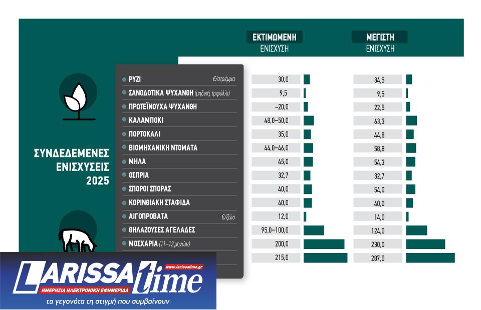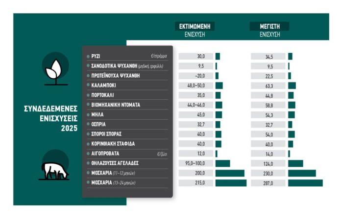 Για 12 προϊόντα παίρνει σειρά η πίστωση των συνδεδεµένων ενισχύσεων έως τέλος Μαΐου, µε το πριµ σε όσπρια, µηδική-τριφύλλι και κορινθιακή σταφίδα να διαµορφώνεται απευθείας στο µέγιστο ποσό. Για τα υπόλοιπα προϊόντα, το ποσό ενίσχυσης αναµένεται να κυµανθεί κοντά στις πιστώσεις του έτους ενίσχυσης 2024, και ύστερα, στην τελική εξόφληση, δηλαδή είτε τον Ιούνιο, είτε τον Οκτώβριο, θα γίνει µία συµπληρωµατική πληρωµή ώστε να πάνε τα πριµ και σε αυτά στις µέγιστες τιµές, όπως έχει υποσχεθεί η κυβέρνηση.