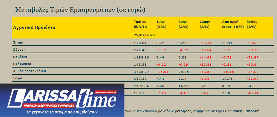 Η θετική δυναμική στις διεθνείς κεφαλαιαγορές επηρέασε και τον δείκτη αγροτικών προϊόντων, ο οποίος κατέγραψε άνοδο. Παρά τη συνολική ενίσχυση, η εικόνα στις επιμέρους αγορές παρέμεινε μεικτή. Κέρδη, που αντανακλούν ισχυρή ζήτηση, σημείωσαν οι τιμές σε σιτάρι, σόγια, βοοειδή και βαμβάκι. Στον αντίποδα, βρέθηκαν η ζάχαρη, το καλαμπόκι, χυμός πορτοκαλιού και το ρύζι, καθώς οι τιμές τους υποχώρησαν υποδηλώνοντας εξομάλυνση των προηγούμενων ανοδικών πιέσεων και διαφοροποίηση των θεμελιωδών παραγόντων.