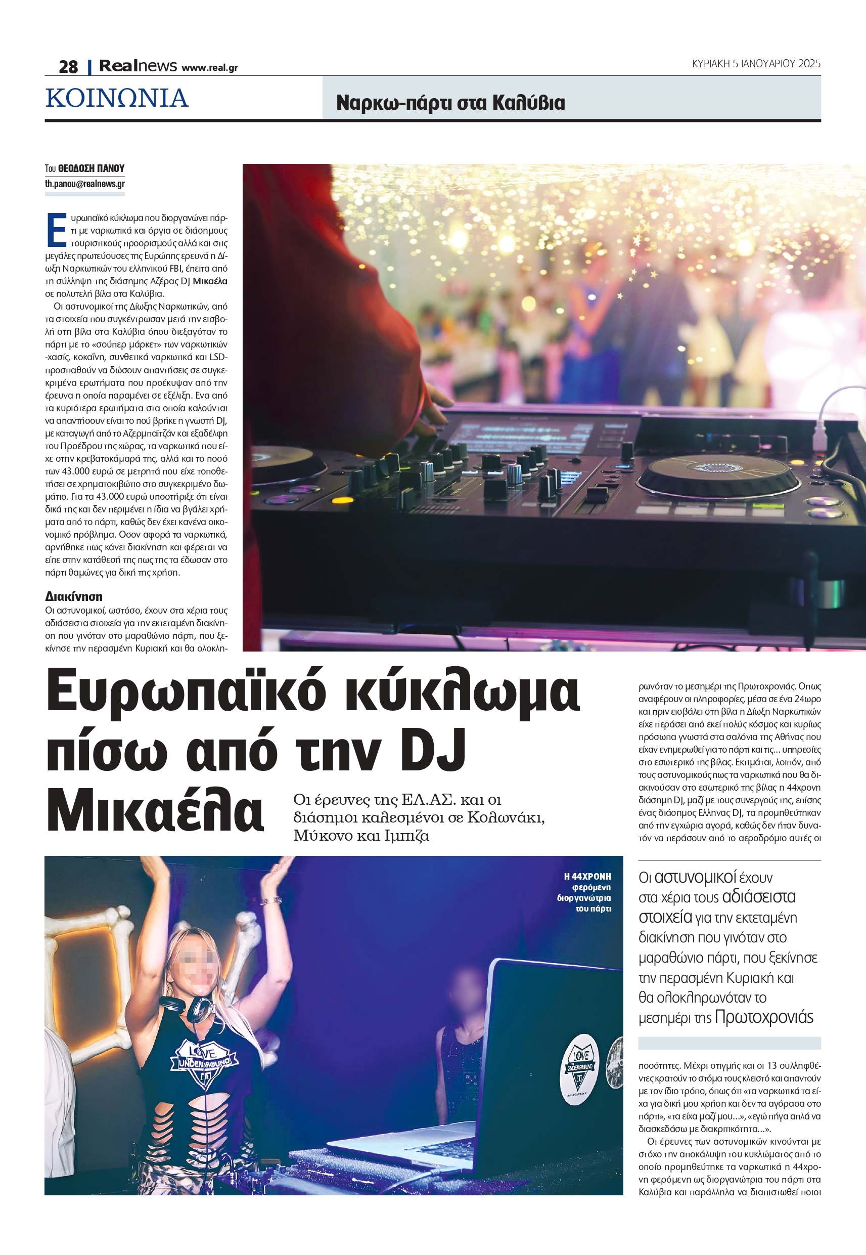 Ευρωπαϊκό κύκλωμα που διοργανώνει πάρτι με ναρκωτικά και όργια σε διάσημους τουριστικούς προορισμούς αλλά και στις μεγάλες πρωτεύουσες της Ευρώπης ερευνά η Δίωξη Ναρκωτικών του ελληνικού FBΙ, έπειτα από τη σύλληψη της διάσημης Αζέρας DJ Μικαέλα σε πολυτελή βίλα στα Καλύβια.