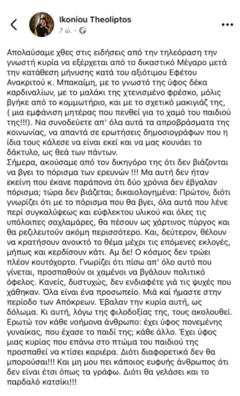 Σε ανάρτηση που πλέον έχει κατέβει από το Facebook, ο Μητροπολίτης Ικονίου Θεόληπτος φέρεται να είχε γράψει: «Απολαύσαμε χθες στις ειδήσεις από την τηλεόραση την γνωστή κυρία να εξέρχεται από το δικαστικό Μέγαρο μετά την κατάθεση μήνυσης κατά του αξιότιμου Εφέτου Ανακριτού κ. Μπακαίμη, με το γνωστό της ύφος δέκα καρδιναλίων, με το μαλάκι της χτενισμένο φρέσκο, μόλις βγήκε από το κομμωτήριο, και με το σχετικό μακιγιάζ της (μια εμφάνιση μητέρας που πενθεί για το χαμό του παιδιού της!!!). Να συνοδεύετε απ’ όλα αυτά τα απροβράσματα της κοινωνίας, να απαντά σε ερωτήσεις δημοσιογράφων που η ίδια τους κάλεσε να είναι εκεί και να μας κουνάει το δάκτυλο, ως θεά των πάντων.