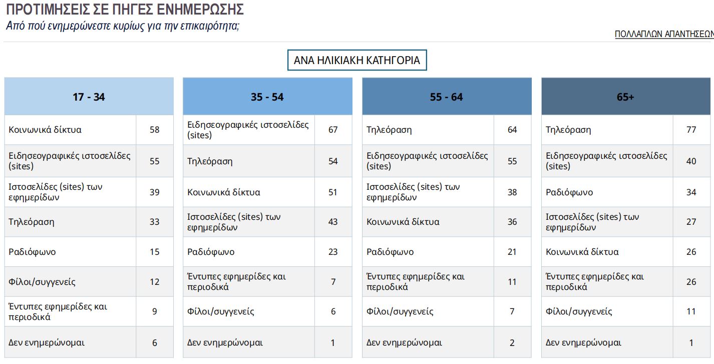 - Ειδική μνεία, τέλος, θα πρέπει να γίνει στα λεγόμενα «νεανικά κοινά» που αποτελούν τον βασικό στόχο των ΜΜΕ και την πιο δυναμική αγορά τους. Η έρευνα καταγράφει τη χαμηλή προτίμηση των νεότερων (17-34 ετών) στην τηλεόραση ως πηγή ενημέρωσης, μόνο 33% έναντι ενός 64% στις ηλικίες 55-64 και 77% στους άνω των 65. Η τηλεόραση έχει απολέσει τον ηγετικό της ρόλο στις νεότερες γενιές, οι οποίες στρέφονται περισσότερο στα κοινωνικά δίκτυα (58%) και τις ειδησεογραφικές ιστοσελίδες (55%) για την ενημέρωσή τους. Υπάρχει, συνεπώς, μια σαφής γενεακή μετατόπιση στον τρόπο κατανάλωσης ειδήσεων και, κατά συνέπεια, ανάγκη επαναπροσδιορισμού των στρατηγικών ενημέρωσης των παραδοσιακών μέσων (για παράδειγμα, οι νεότερες ηλικίες θα προτιμούσαν μια πιο χρηστική, πιο προσωποποιημένη ενημέρωση).