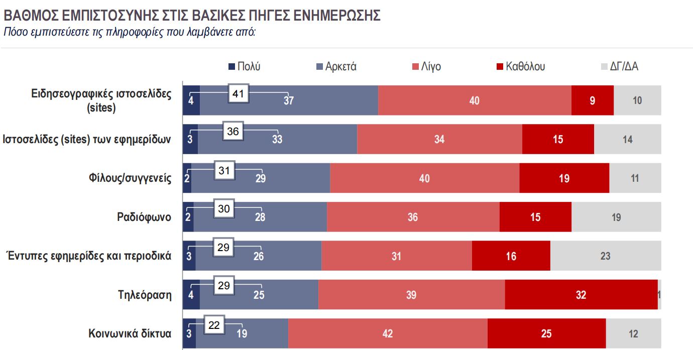 - Ο βαθμός εμπιστοσύνης στα ΜΜΕ (trustin media) καταγράφεται χαμηλός για όλα τα Μέσα, παραδοσιακά όπως η τηλεόραση, αλλά και νέα όπως τα κοινωνικά δίκτυα. Το ίδιο κριτικά στέκονται οι ερωτώμενοι απέναντι στους Έλληνες δημοσιογράφους όσον αφορά στη σχέση τους με την πολιτική εξουσία.