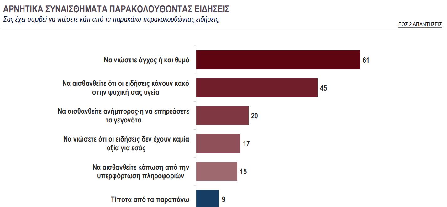 Μεταξύ άλλων αναδεικνύεται ότι παρόλο που η ελληνική κοινωνία αναγνωρίζει τη δεσπόζουσα σημασία της ενημέρωσης (92%) και επιφυλάσσει στον Τύπο τον ρόλο του ελεγκτή της εξουσίας (74%), η παρακολούθηση των ειδήσεων φαντάζει συχνά μία άσκηση ψυχικής ισορροπίας, καθώς 6 στους 10 ερωτώμενους έχουν νιώσει άγχος ή θυμό παρακολουθώντας τις ειδήσεις.