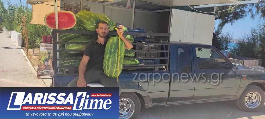 Ενα καρπούζι γίγας, βάρους σχεδόν 30 κιλών και 60 εκατοστών, έκοψε από το χωράφι του ένας παραγωγός στα Χανιά.