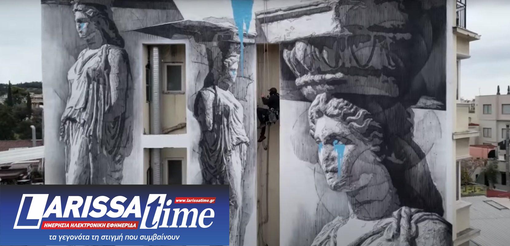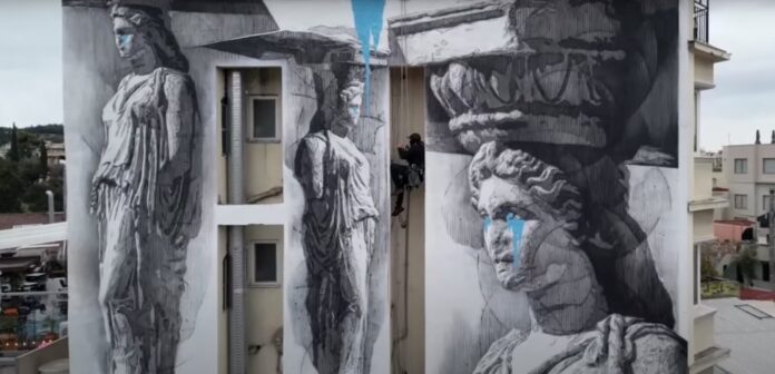 Ο καλλιτέχνης ΙΝΟ υπέγραψε μια εντυπωσιακή τοιχογραφία με τίτλο “Καρυάτιδες που Κλαίνε”, που διακοσμεί κτίριο στην Ερμού στο Μοναστηράκι. Το έργο είναι μεγάλης κλίμακας και απεικονίζει τρεις ασπρόμαυρες Καρυάτιδες, οι οποίες έχουν μπλε δάκρυα.