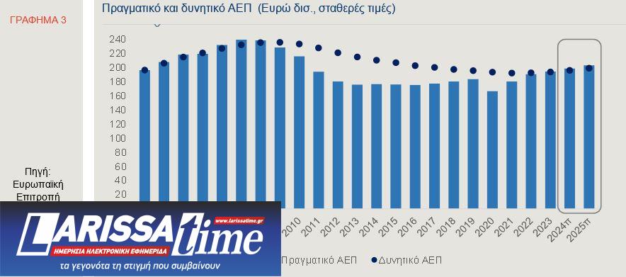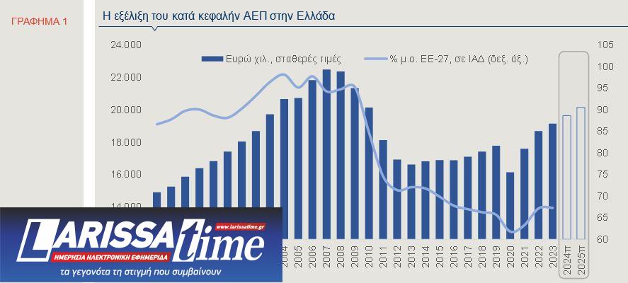 Σύμφωνα με τις εαρινές προβλέψεις της Ευρωπαϊκής Επιτροπής, το κατά κεφαλήν ΑΕΠ της Ελλάδας αναμένεται να αυξηθεί με υψηλότερο ρυθμό σε σύγκριση με αυτό της ΕΕ-27 τη διετία 2024-2025 και, ως εκ τούτου, η αναλογία προς τον ευρωπαϊκό μέσο όρο θα βελτιωθεί περαιτέρω.