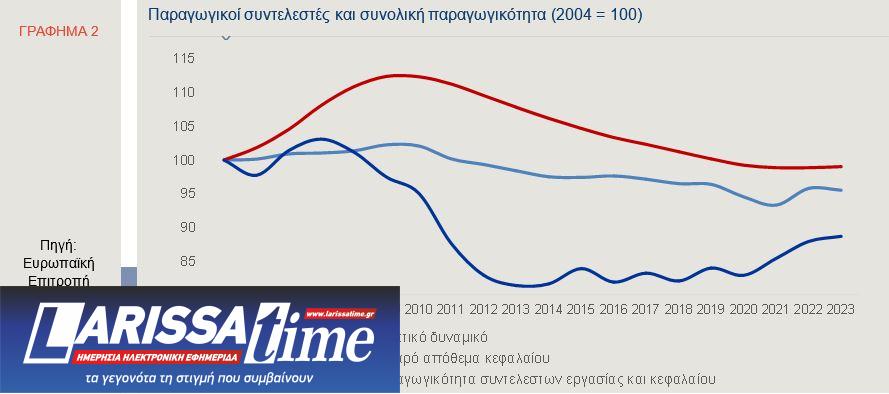 Η άνοδος του δυνητικού ΑΕΠ, την τελευταία διετία, προήλθε τόσο από την αύξηση των παραγωγικών συντελεστών, δηλαδή του κεφαλαίου και της εργασίας, όσο και από την άνοδο της συνολικής παραγωγικότητας (total factor productivity). Συγκεκριμένα, το απόθεμα φυσικού κεφαλαίου, το οποίο δέχτηκε σημαντικό πλήγμα κατά τη διάρκεια της οικονομικής κρίσης στη χώρα, καθώς οι επενδύσεις υπολείπονταν των αποσβέσεων με αποτέλεσμα τη διάβρωσή του, κατέγραψε οριακή άνοδο το 2023, για πρώτη φορά από το 2009 (Γράφημα 2). Παράλληλα, ιδιαίτερα έντονη ήταν η αύξηση που κατέγραψε η παραγωγικότητα των συντελεστών κεφαλαίου και εργασίας, της τάξης του 3% ετησίως τη διετία 2021-2022, ενώ το 2023 αυξήθηκε κατά 0,9%. Στις εξελίξεις αυτές σημαντικό ρόλο διαδραμάτισε η διαρκής άνοδος των επενδύσεων από το 2020 και μετά. Τέλος, το εργατικό δυναμικό, αν και δεν έχει ανακάμψει από την προηγούμενη δεκαετία, όταν πραγματοποιήθηκαν σημαντικές εκροές καταρτισμένου ανθρώπινου κεφαλαίου στο εξωτερικό (brain drain), κατέγραψε σημαντική άνοδο το 2022 και οριακή πτώση το 2023.