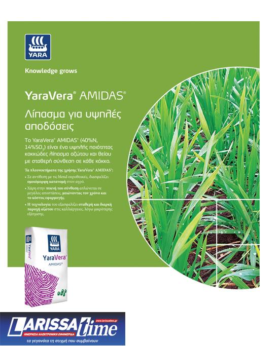 Το λίπασµα YaraVera AMIDAS είναι το κατάλληλο λίπασµα για την επιφανειακή λίπανση των σιτηρών, ιδιαίτερα όταν αυτή πρόκειται να εφαρµοστεί σε µία δόση. Το YaraVera AMIDAS 40-0-0 + 14SO3 κυριαρχεί παγκοσµίως στις επιφανειακές λιπάνσεις των σιτηρών, διαθέτοντας µια ειδική τεχνολογία και σύνθεση που εξασφαλίζουν συνεχή και σταθερή τροφοδοσία των φυτών µε άζωτο και θείο για µεγάλο χρονικό διάστηµα. ∆ιαφέρει από τα υπόλοιπα, κοινά λιπάσµατα ουρίας-θειικής αµµωνίας που κυκλοφορούν στην αγορά µε ίδιες µονάδες αζώτου, στα εξής: