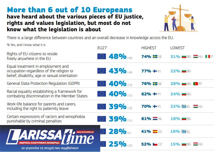 -Πάνω από το 60% των ερωτηθέντων αναφέρει ότι γνωρίζει διάφορα νομοθετήματα της ΕΕ για τη δικαιοσύνη, τα δικαιώματα και τις αξίες, με το υψηλότερο επίπεδο ενημέρωσης σχετικά με: δικαιώματα των πολιτών της ΕΕ και των οικογενειών τους να διαμένουν ελεύθερα οπουδήποτε εντός της ΕΕ (77%), ίση μεταχείριση στην απασχόληση και το επάγγελμα ανεξαρτήτως θρησκείας ή πεποιθήσεων, αναπηρίας, ηλικίας ή σεξουαλικού προσανατολισμού (74%) καθώς και του Γενικού Κανονισμού Προστασίας Δεδομένων της ΕΕ – GDPR και απόφαση που καθιστά ορισμένες μορφές και εκφράσεις ρατσισμού και ξενοφοβίας τιμωρούμενες με ποινικές κυρώσεις (και οι δύο 72%).