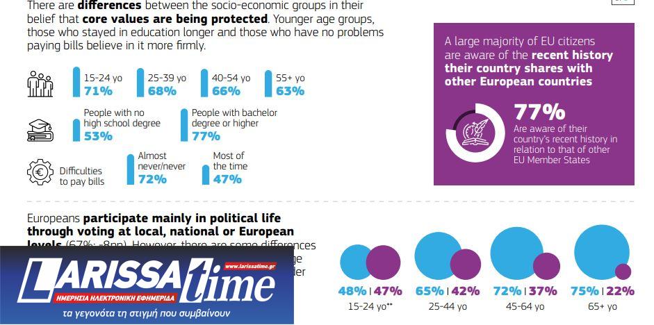 Η αντίληψη ότι οι αξίες της ΕΕ προστατεύονται ποικίλλει ευρέως μεταξύ των κρατών μελών, από 92% στη Φινλανδία (+7) έως 32% (-11) στην Ελλάδα. Διαφορές υπάρχουν και ανάμεσα στις κοινωνικοοικονομικές ομάδες με τις νεότερες ηλικιακές ομάδες με ανώτατη εκπαίδευση και εκείνες που δεν έχουν πρόβλημα να πληρώσουν τους λογαριασμούς τους να πιστεύουν πως προστατεύονται επαρκώς.