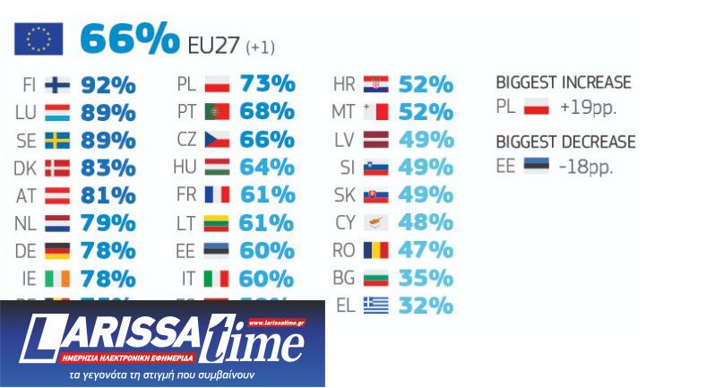 Συγκεκριμένα, μόλις το 32% των ερωτηθέντων στην Ελλάδα πιστεύει ότι οι βασικές αξίες της ΕΕ προστατεύονται επαρκώς στη χώρα μας. Στην Ευρώπη των «27», κατά μέσο όρο, το 66% των ερωτηθέντων πιστεύει ότι προστατεύονται επαρκώς ενώ σε 20 χώρες, τουλάχιστον οι μισοί από όλους τους ερωτηθέντες, βάζουν θετικό πρόσημο.