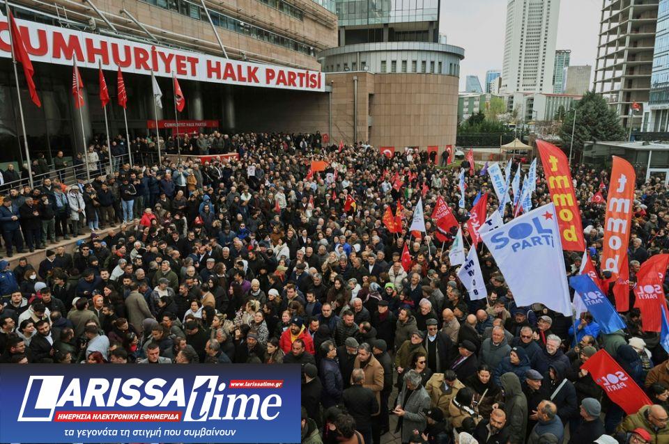 Κόσμος έξω από τα κεντρικά γραφεία του αντιπολιτευόμενου Ρεπουμπλικανικού Λαϊκού Κόμματος ή (CHP) διαμαρτύρεται για τη σύλληψη του δημάρχου της Κωνσταντινούπολης Εκρέμ Ιμάμογλου