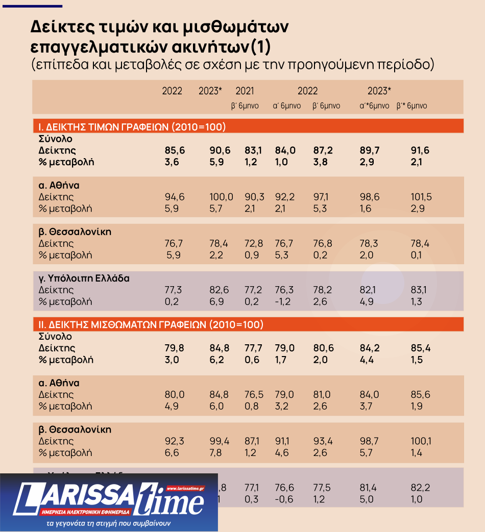 Για το σύνολο του 2023, τα μισθώματα γραφείων όλων των κατηγοριών σε ονομαστικούς όρους για το σύνολο της Ελλάδος αυξήθηκαν κατά 6,2% (προσωρινά στοιχεία). Με διάκριση κατά γεωγραφική περιοχή, ο αντίστοιχος μέσος ετήσιος ρυθμός αύξησης των μισθωμάτων για την Αθήνα ανήλθε σε 6,0%, για τη Θεσσαλονίκη σε 7,8% και για την υπόλοιπη Ελλάδα σε 6,1%.