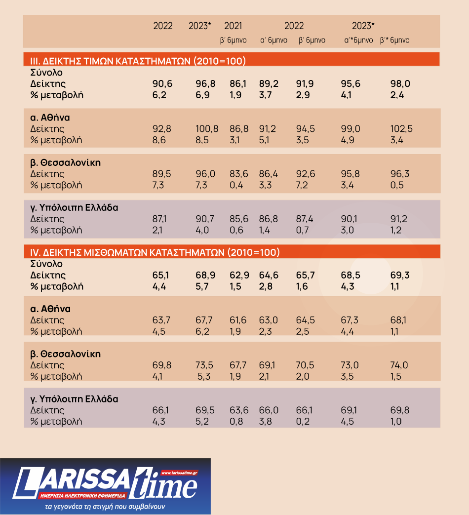 Κατά το β΄ εξάμηνο του 2023, τα μισθώματα των καταστημάτων αυξήθηκαν κατά 1,1% σε σχέση με το α΄ εξάμηνο του 2023 για το σύνολο της χώρας (προσωρινά στοιχεία). Οι αντίστοιχοι ρυθμοί αύξησης των μισθωμάτων ήταν 1,6% κατά το β΄ εξάμηνο του 2022 και 4,3% κατά το α΄ εξάμηνο του 2023 (αναθεωρημένα στοιχεία).