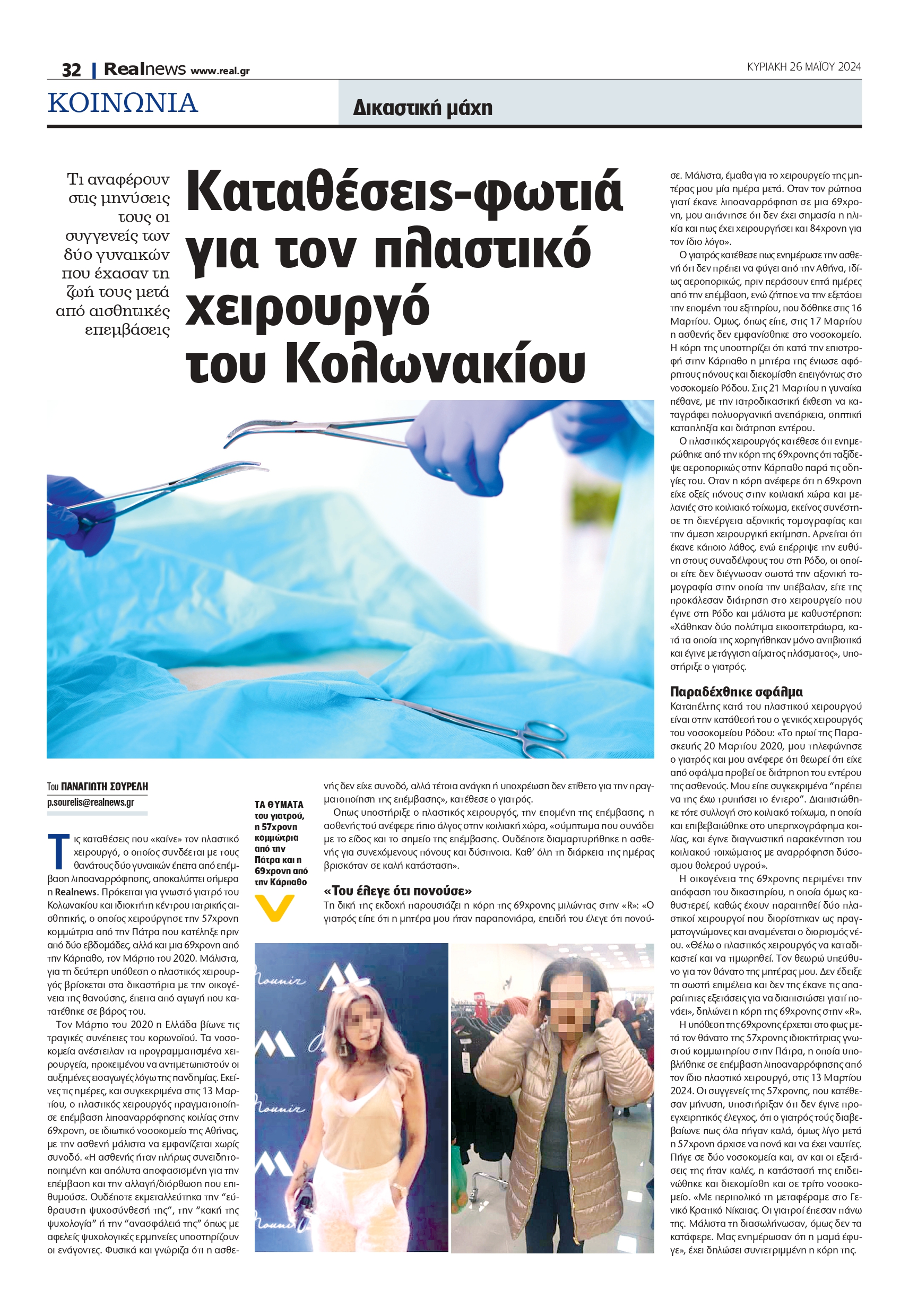 Η υπόθεση της 69χρονης έρχεται στο φως μετά τον θάνατο της 57χρονης ιδιοκτήτριας γνωστού κομμωτηρίου στην Πάτρα, η οποία υποβλήθηκε σε επέμβαση λιποαναρρόφησης από τον ίδιο πλαστικό χειρουργό, στις 13 Μαρτίου 2024. Οι συγγενείς της 57χρονης, που κατέθεσαν μήνυση, υποστήριξαν ότι δεν έγινε προεγχειρητικός έλεγχος, ότι ο γιατρός τούς διαβεβαίωνε πως όλα πήγαν καλά, όμως λίγο μετά η 57χρονη άρχισε να πονά και να έχει ναυτίες. Πήγε σε δύο νοσοκομεία και, αν και οι εξετάσεις της ήταν καλές, η κατάστασή της επιδεινώθηκε και διεκομίσθη και σε τρίτο νοσοκομείο. «Με περιπολικό τη μεταφέραμε στο Γενικό Κρατικό Νίκαιας. Οι γιατροί έπεσαν πάνω της. Μάλιστα τη διασωλήνωσαν, όμως δεν τα κατάφερε. Μας ενημέρωσαν ότι η μαμά έφυγε», έχει δηλώσει συντετριμμένη η κόρη της.