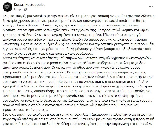 «Εδώ και καιρό, μια γυναίκα με την οποίαν είχαμε μία περιστασιακή γνωριμία πριν από δώδεκα, δεκατρία χρόνια, με απειλεί, μέσω μηνυμάτων και υπαινιγμών στα social media, ότι θα με καταγγείλει για βιασμό» έγραψε στην ανάρτησή του ο σκηνοθέτης και σε άλλο σημείο της ανάρτησής του πρόσθεσε: «Λόγοι ευθύτητας και αξιοπρέπειας μού επιβάλλουν να τοποθετηθώ δημόσια: Η «καταγγελία» αυτή, αν και εφόσον όντως αφορά εμένα, είναι απολύτως ψευδής και αποτελεί μία χυδαία απόπειρα συκοφάντησής μου. Οι αρχές και το ήθος μου είναι γνωστές σε όλους όσους συνεργάσθηκα όλες αυτές τις δεκαετίες».