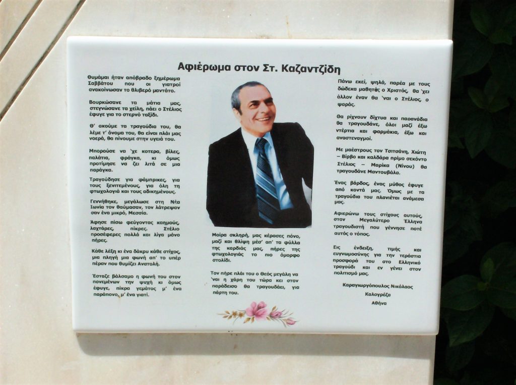 Ο Στέλιος Καζαντζίδης, εμβληματική μορφή του ελληνικού τραγουδιού, γεννήθηκε και μεγάλωσε στη Νέα Ιωνία, μια περιοχή που αποτέλεσε σημείο αναφοράς στη ζωή και το έργο του. Η αγάπη του για τον τόπο καταγωγής του αποτυπώνεται τόσο στις αναμνήσεις όσο και στη μουσική του διαδρομή, αφήνοντας ανεξίτηλο το στίγμα του στην ελληνική λαϊκή παράδοση.