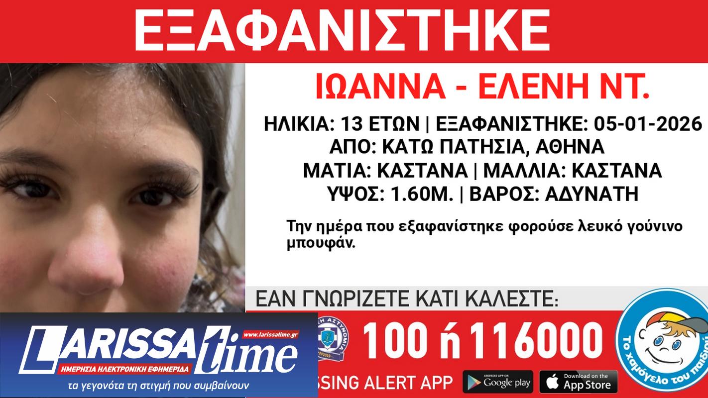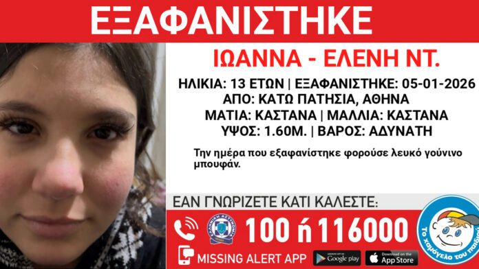 Συναγερμός έχει σημάνει για την εξαφάνιση μιας 13χρονης στα Κάτω Πατήσια, η οποία χάθηκε στις 5 Ιανουαρίου 2026. Την υπόθεση έχει αναλάβει «Το Χαμόγελο του Παιδιού», το οποίο ενημερώθηκε σήμερα για την εξαφάνιση και εξέδωσε Missing Alert προκειμένου να εντοπιστεί το κορίτσι.