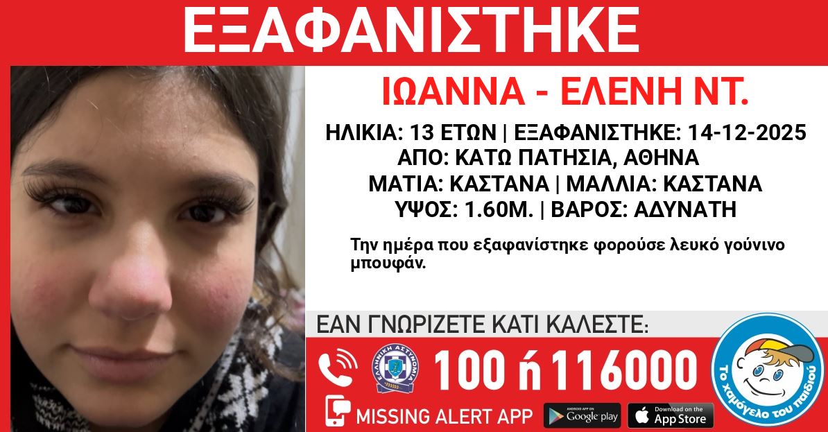 «Στις 14/12/2025, βραδινές ώρες, εξαφανίστηκε από τη περιοχή των Κάτω Πατησίων, στην Αθήνα, η Ιωάννα – Ελένη Ντ., 13 ετών. Το «Χαμόγελο του Παιδιού» ενημερώθηκε σήμερα, 16/12/2025, για την εξαφάνισή της και προχώρησε άμεσα στη δημοσιοποίηση των στοιχείων της, κατόπιν αιτήματος της οικογένειάς της, καθώς ενδέχεται να συντρέχουν λόγοι που θέτουν τη ζωή της σε κίνδυνο. Η Ιωάννα – Ελένη Ντ. έχει ύψος 1,60 μ., είναι αδύνατη, έχει καστανά μαλλιά και καστανά μάτια. Την ημέρα που εξαφανίστηκε φορούσε λευκό γούνινο μπουφάν».