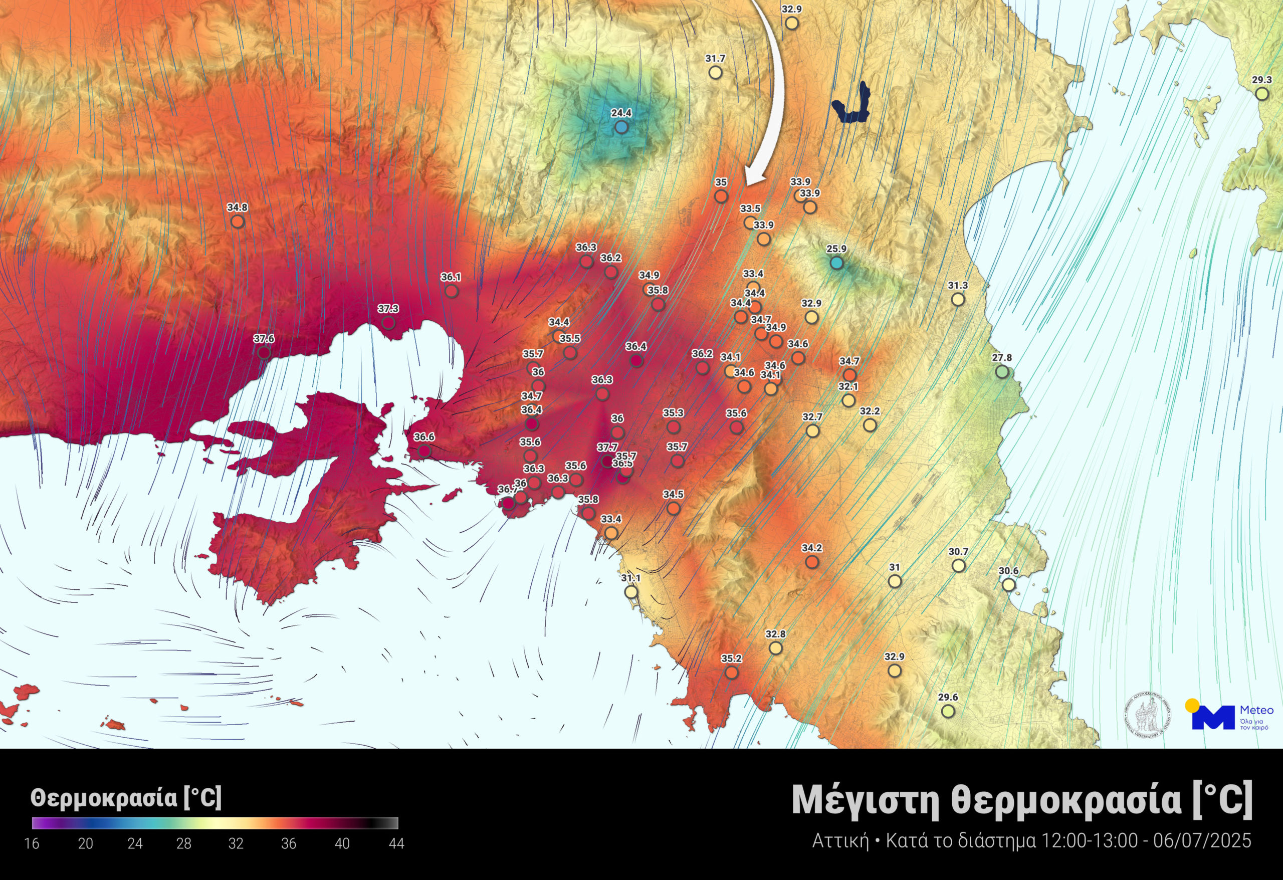 Όπως παρουσιάζεται στον παρακάτω χάρτη, σύμφωνα με το δίκτυο αυτόματων μετεωρολογικών σταθμών του Εθνικού Αστεροσκοπείου Αθηνών / meteo.gr, 68 μετεωρολογικοί σταθμοί του δικτύου κατέγραψαν μέγιστες θερμοκρασίες άνω των 37 °C.