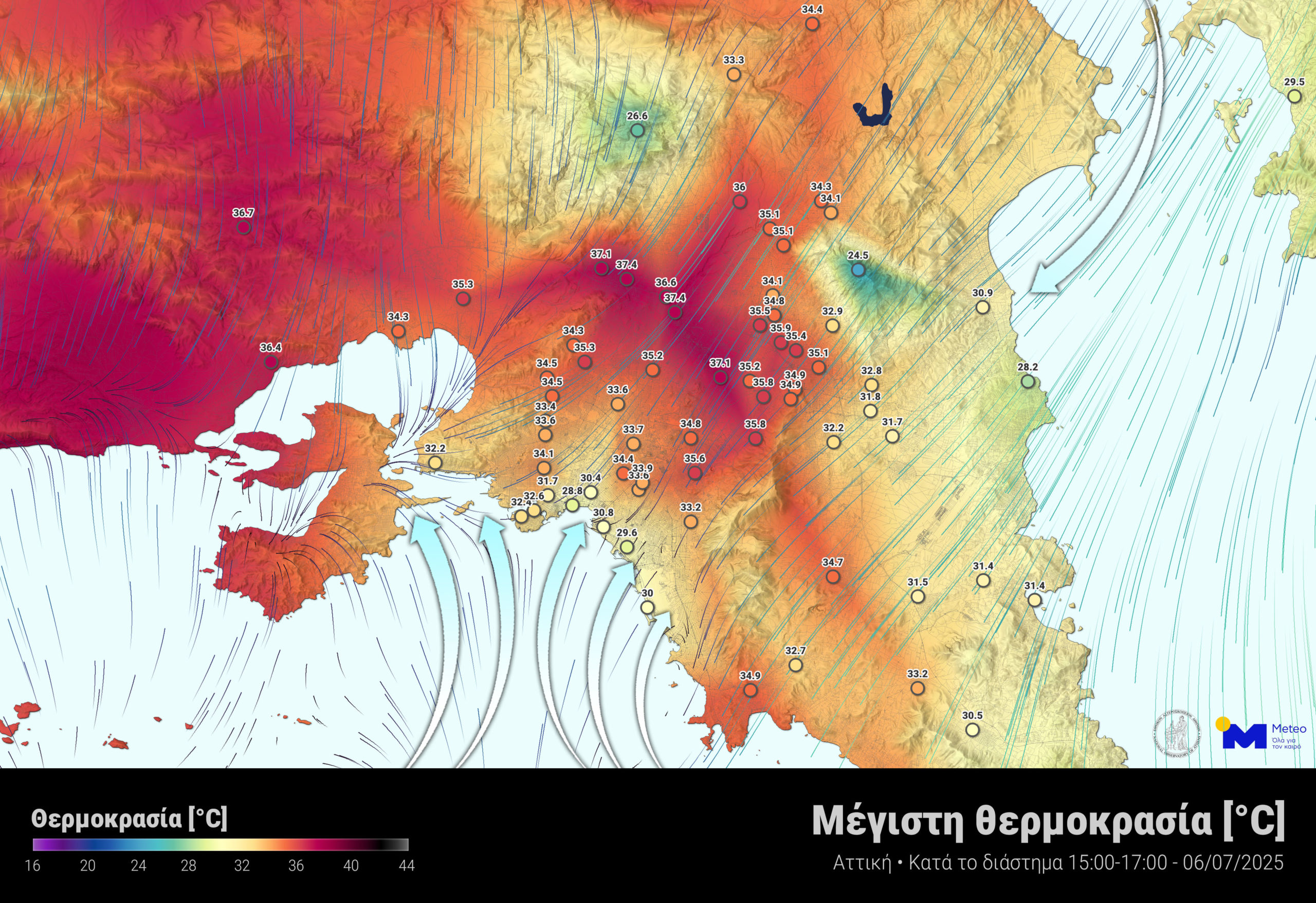 Ιδιαίτερη αναφορά αξίζει να γίνει στην επίδραση της θαλάσσιας αύρας στην πόλη της Αθήνας. Κατά το χρονικό διάστημα 12:00-13:00, καταγράφηκαν οι μέγιστες θερμοκρασίες της ημέρας στις περισσότερες περιοχές της πόλης, οι οποίες ήταν της τάξεως των 36-37 °C. Στη συνέχεια προοδευτικά επικράτησε θαλάσσια αύρα, δηλαδή άνεμοι νοτίων διευθύνσεων προερχόμενοι από το Σαρωνικό, με αποτέλεσμα τη σημαντική πτώση της θερμοκρασίας, στα νότια παράκτια τμήματα, αλλά σε περιοχές των νοτίων προαστίων της πόλης.