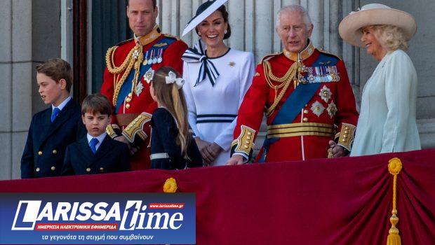 Ο βασιλιάς Κάρολος, η βασίλισσα Καμίλα, ο πρίγκιπας Γουίλιαμ, πριγκίπισσα της Ουαλίας, Κέιτ ο πρίγκιπας Τζορτζ, η πριγκίπισσα Σαρλότ, ο πρίγκιπας Λούις εμφανίζονται στο μπαλκόνι του παλατιού του Μπάκιγχαμ στο πλαίσιο της παρέλασης «Trooping the Colour» προς τιμήν του βασιλιά της Βρετανίας Καρόλου για τα επίσημα γενέθλιά του (Πηγή: REUTERS/Hollie Adams)