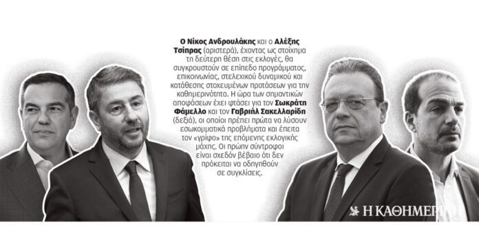 Η δεύτερη κόντρα εξελίσσεται στον χώρο της Αριστεράς. Τα κόμματα του Σωκράτη Φάμελλου και του Γαβριήλ Σακελλαρίδη πρώτα έχουν να αντιμετωπίσουν τους εαυτούς τους και μετά να λύσουν τον «γρίφο» της επόμενης εκλογικής μάχης. Δεν κατάφεραν ποτέ να τα βρουν μεταξύ τους και η αλλαγή «σκυτάλης» στην Πατησίων σήμανε και την ώρα σημαντικών αποφάσεων. Ο ΣΥΡΙΖΑ κινείται δημοσκοπικά στη ζώνη του 4%-5% και η απειλή αποχωρήσεων προς το κόμμα Τσίπρα αποτελεί έναν διαρκή φόβο, καθώς το κόμμα βρίσκεται πλέον στο μεταίχμιο. Η πλειοψηφία στην Κουμουνδούρου περιμένει τον πρώην πρωθυπουργό να κάνει το πρώτο βήμα και όλες οι συνεδριάσεις των οργάνων από εδώ και στο εξής θα είναι κρίσιμες.