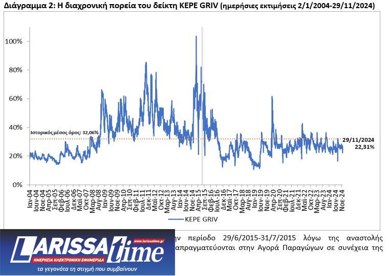 Όσον αφορά στον δείκτη «φόβου» ή KEPE GRIV του ΚΕΠΕ (Κέντρο Προγραμματισμού και Οικονομικών Ερευνών) υποχώρησε τον Νοέμβριο, καθώς έφτασε το 22,31% στις 29/11/2024 από 27,19% στις 31/10/2024.