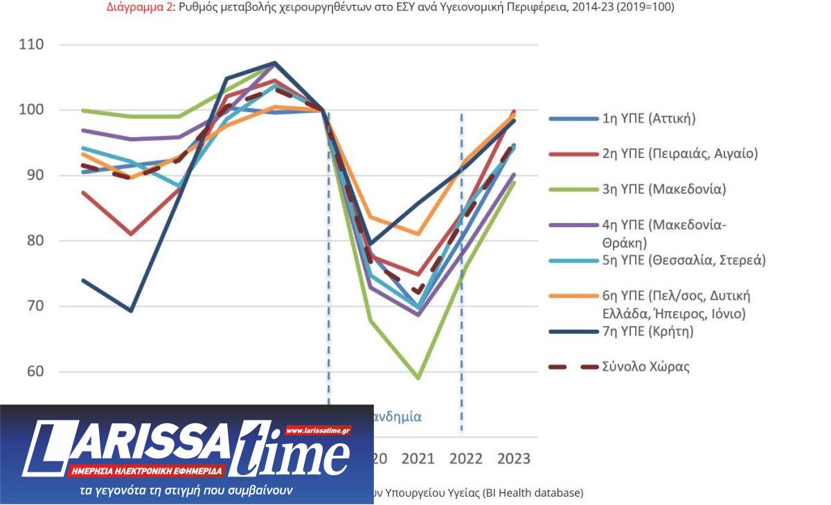 Τα έτη 2022 και 2023 παρατηρήθηκε μια σταδιακή αύξηση των χειρουργικών επεμβάσεων στα νοσοκομεία του ΕΣΥ, χωρίς όμως η χειρουργική δραστηριότητα των δημόσιων νοσοκομείων να ανακάμπτει στα προ-πανδημίας επίπεδα. Πιο συγκεκριμένα το 2023 οι χειρουργικές επεμβάσεις στο ΕΣΥ ήταν κατά 5% λιγότερες σε σχέση με το έτος 2019, με μεγάλη διακύμανση αυτής της υστέρησης μεταξύ των υγειονομικών περιφερειών (από -1% στην 6η ΥΠΕ της Πελοποννήσου, έως -11% στην 3η ΥΠΕ της Μακεδονίας).