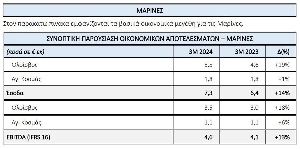 Η εν λόγω σημαντική επίδοση αποδίδεται κυρίως στις ισχυρές πελατειακές σχέσεις, υποστηριζόμενες από τις ετήσιες συμβατικές αυξήσεις στα τέλη ελλιμενισμού. Τα υψηλότερα έσοδα από τις διελεύσεις σκαφών αναψυχής (yachts) συνέβαλαν επίσης στη βελτιωμένη επίδοση των Μαρινών.