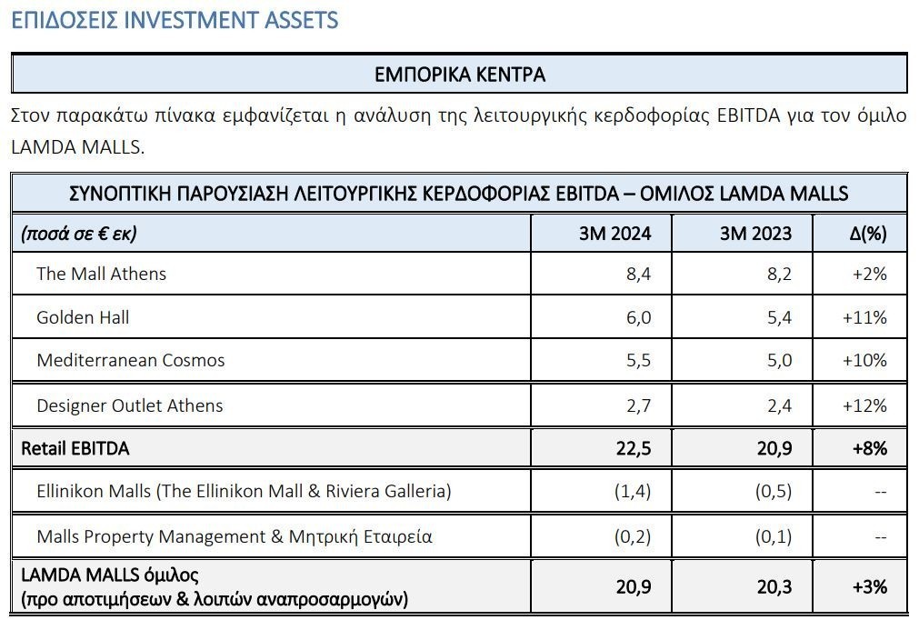 Τα 4 Εμπορικά Κέντρα σε λειτουργία σημείωσαν νέο ρεκόρ Retail EBITDA στα €22,5εκ (αύξηση 8% έναντι του Α’ Τριμήνου 2023), κυρίως λόγω της αύξησης των καθαρών εσόδων από βασικά μισθώματα (αύξηση 8% έναντι του Α’ Τριμήνου 2023) και της αύξησης των εσόδων στάθμευσης (αύξηση 16% έναντι του Α’ Τριμήνου 2023).